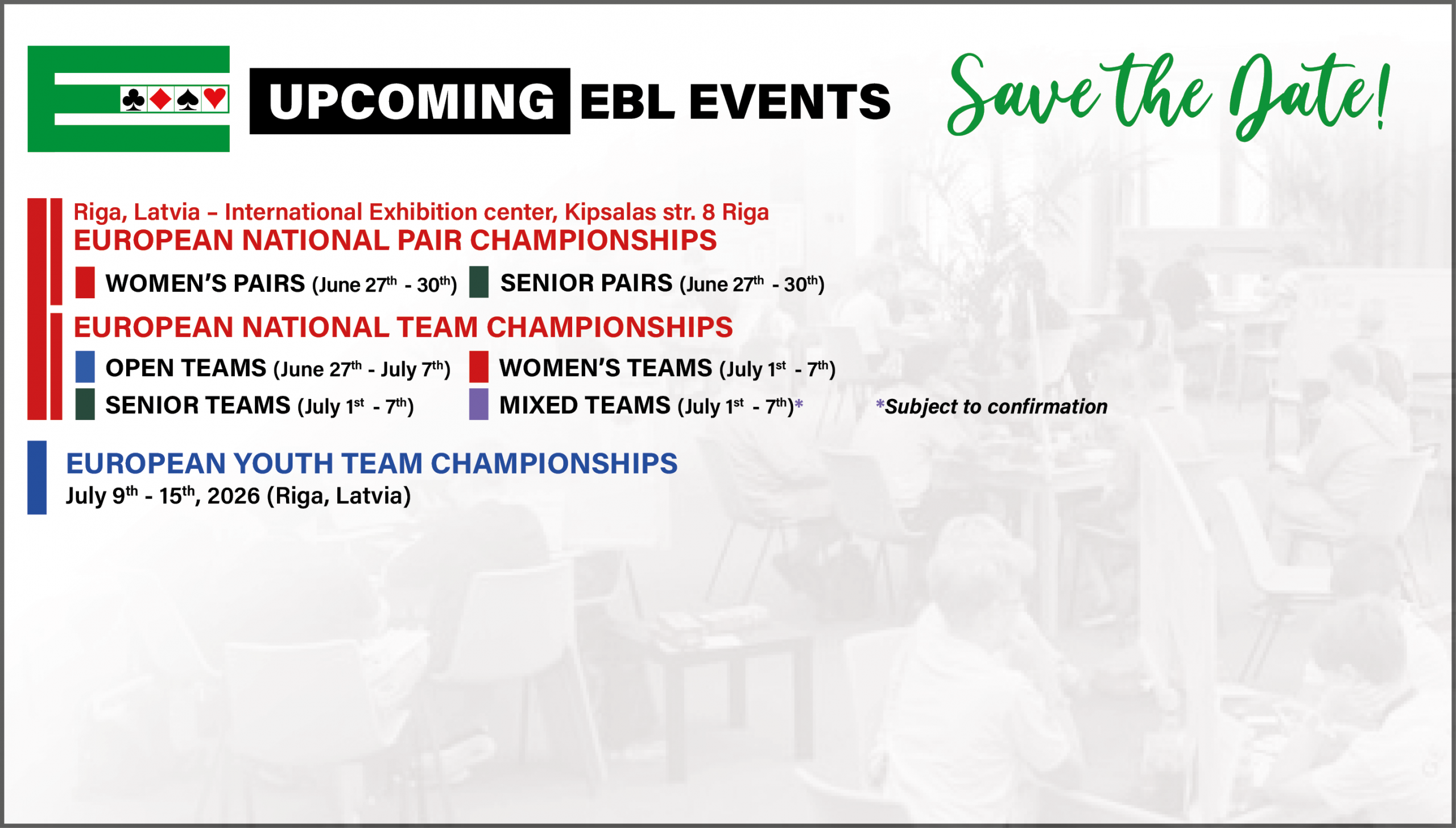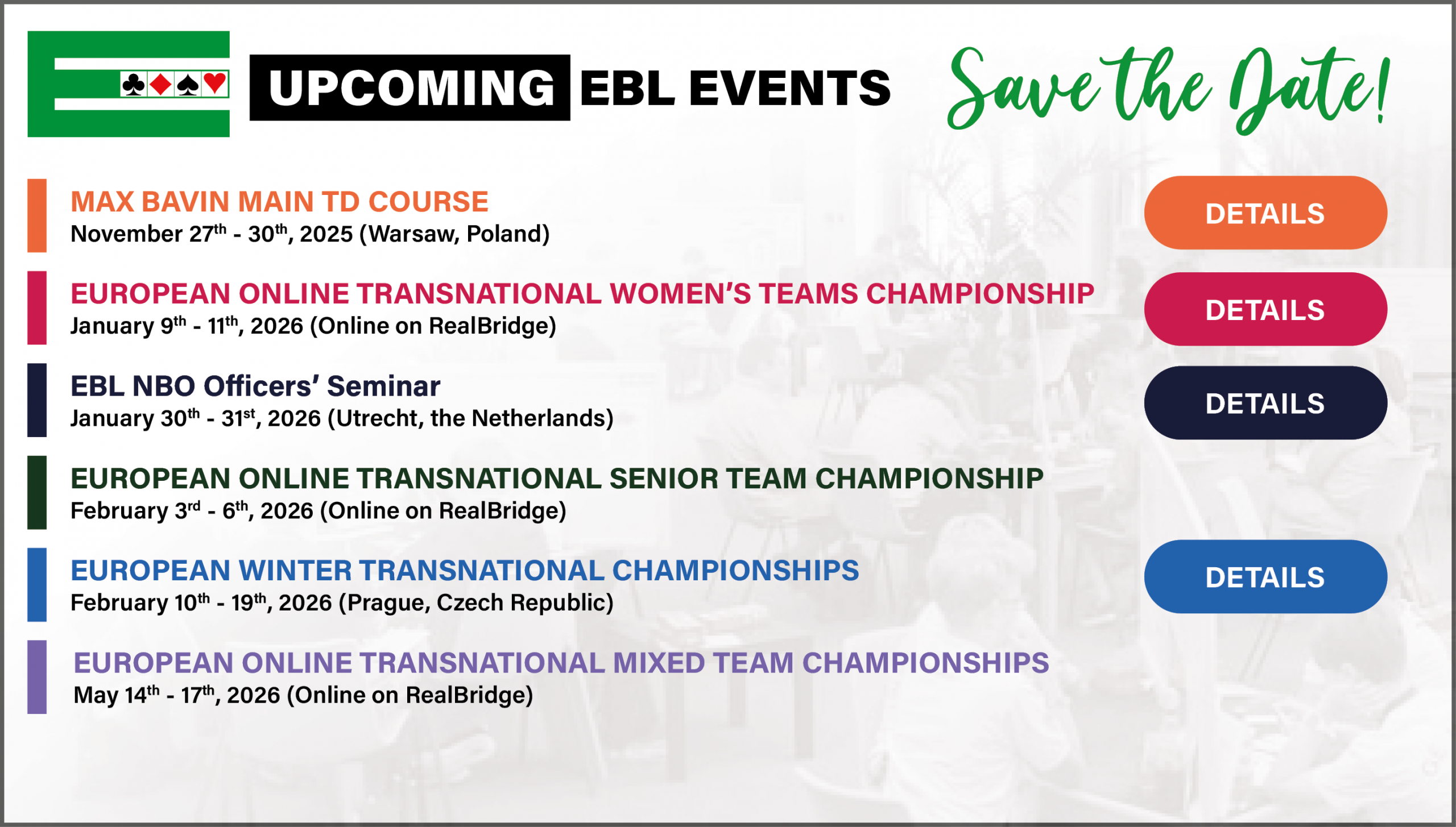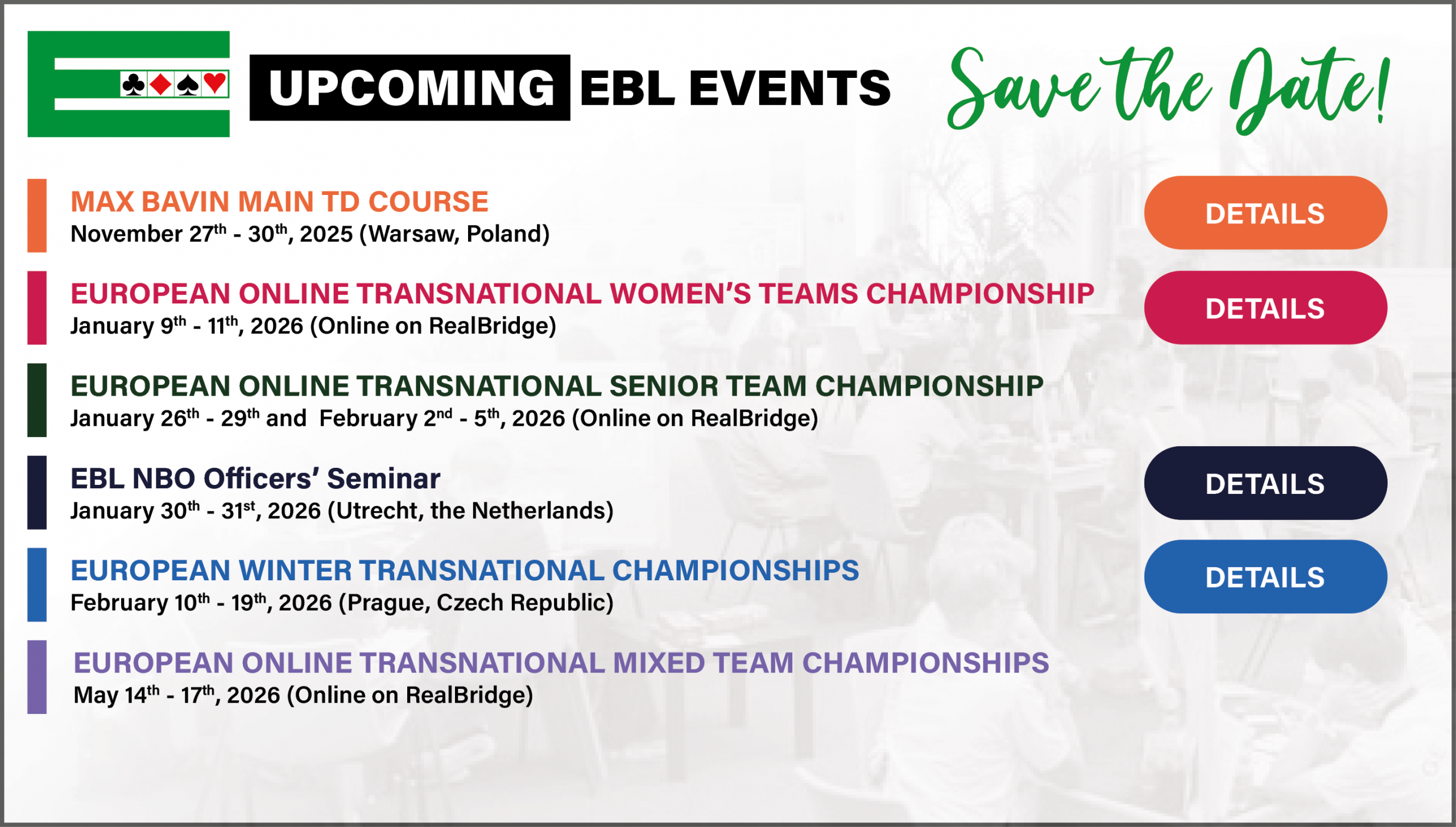The European Bridge League will hold its next Seminar for National Bridge Organisation Officers at the Headquarters of the Dutch Bridge Federation in Utrecht.
