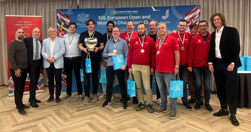 Congratulations again to Bc De Lombard. The club won the Champions’ Cup last year but this time, last year’s winning players are representing the Contact Club from Geneva. Their opponents, in this really grand final, were… De Lombard, of course, playing here with Aarnout Helmich, Jacco Hop, Jan Jansma, Rob Lindeman, Dennis Stuurman, Tim Van De Paverd. After a breathtaking final five boards, De Lombard managed to hold on to their halftime lead, albeit by just 3 IMPs. An unexpected defensive mistake on board 28 (from the allotted 32) brought the tension back but when the smoke cleared, the Dutch had survived. Congratulations thus also go to the new winners who can enjoy the Cup one more year in Rotterdam.