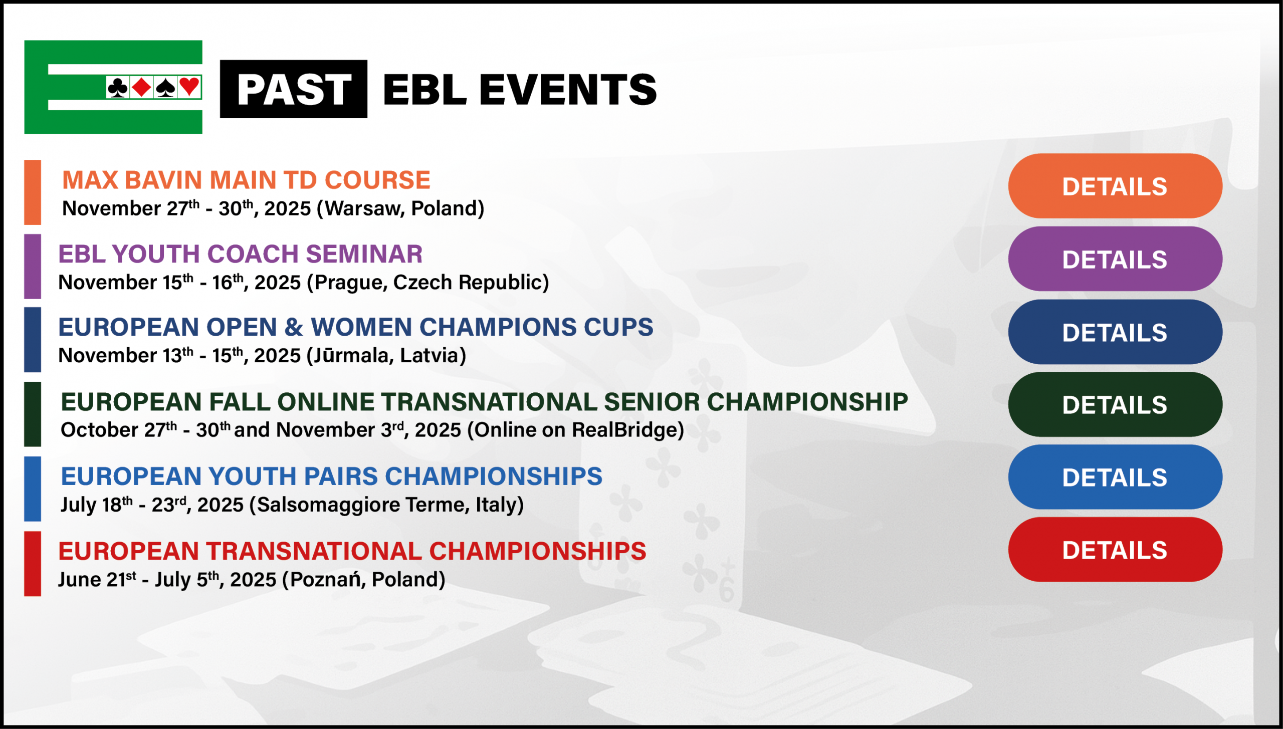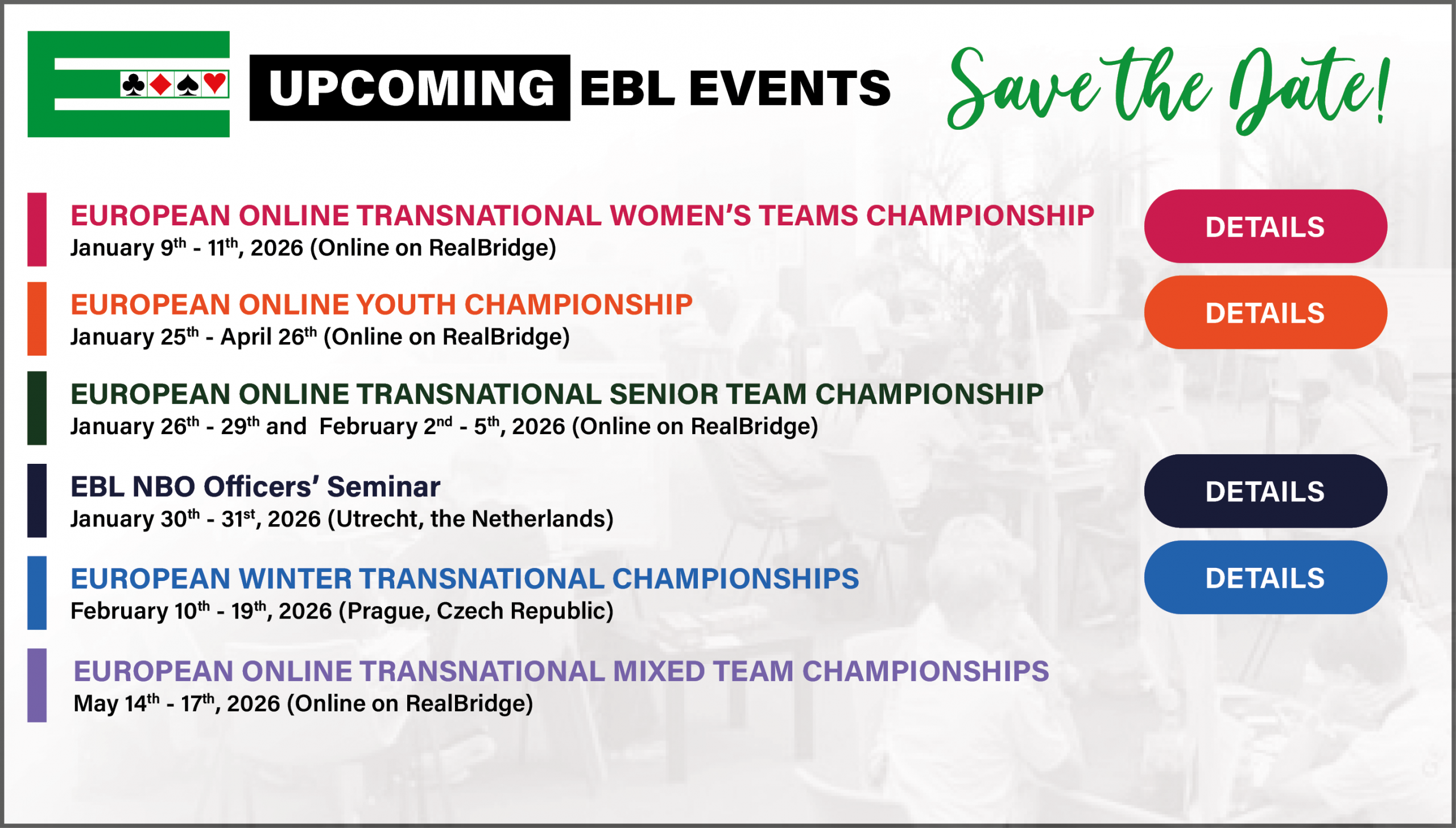 The European Bridge League will hold its next Seminar for National Bridge Organisation Officers at the Headquarters of the Dutch Bridge Federation in Utrecht.
